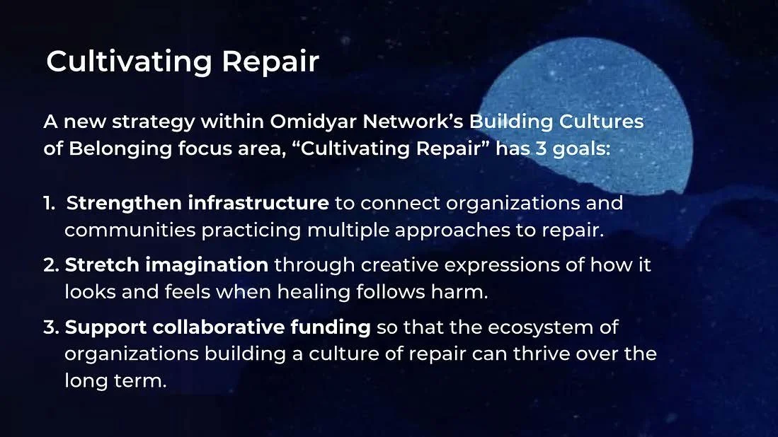Our “Cultivating Repair” strategy at Omidyar Network has three core goals: First, we hope to strengthen infrastructure to connect organizations and communities practicing multiple approaches to repair. Second, we aim to stretch imagination through creative expressions of how it looks and feels when healing follows harm. Third, we will support collaborative funding so that the ecosystem of organizations building a culture of repair can thrive over the long term.